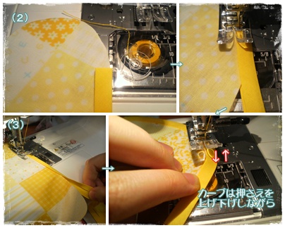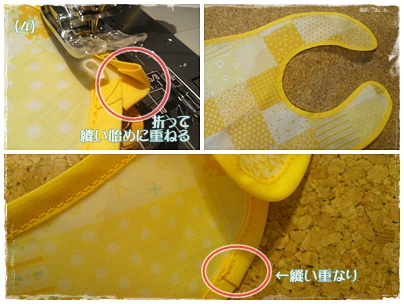 (4)縫い終わりは縁取りテープ端を1cmほど内側に折り、縫い初めに1.5cmほど重なるように縫います。