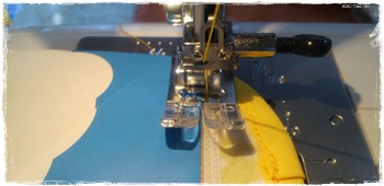 (2)布の端をふちどりテープで挟みこみ、ミシンにセットします。