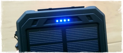 製品を手にしてみて「これは良い!」と思ったのが、特に何もボタン操作等をしなくてもパネルに一定量の光が当たると自動的に充電が開始されること。パネル上部にある4つの点状LEDが点滅し、充電開始/充電中をお知らせしてくれます。